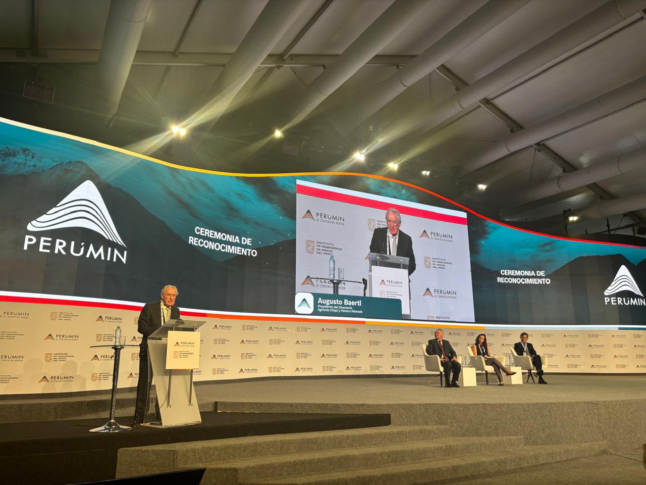Durante Perumin 37 se rindió homenaje a Augusto Baertl, empresario con amplia trayectoria en el sector minero, tres veces presidente de la Sociedad Nacional de Minería Petróleo y Energía (SNMPE), y quien mantiene un activo compromiso por la unión del gremio en favor del desarrollo del país.