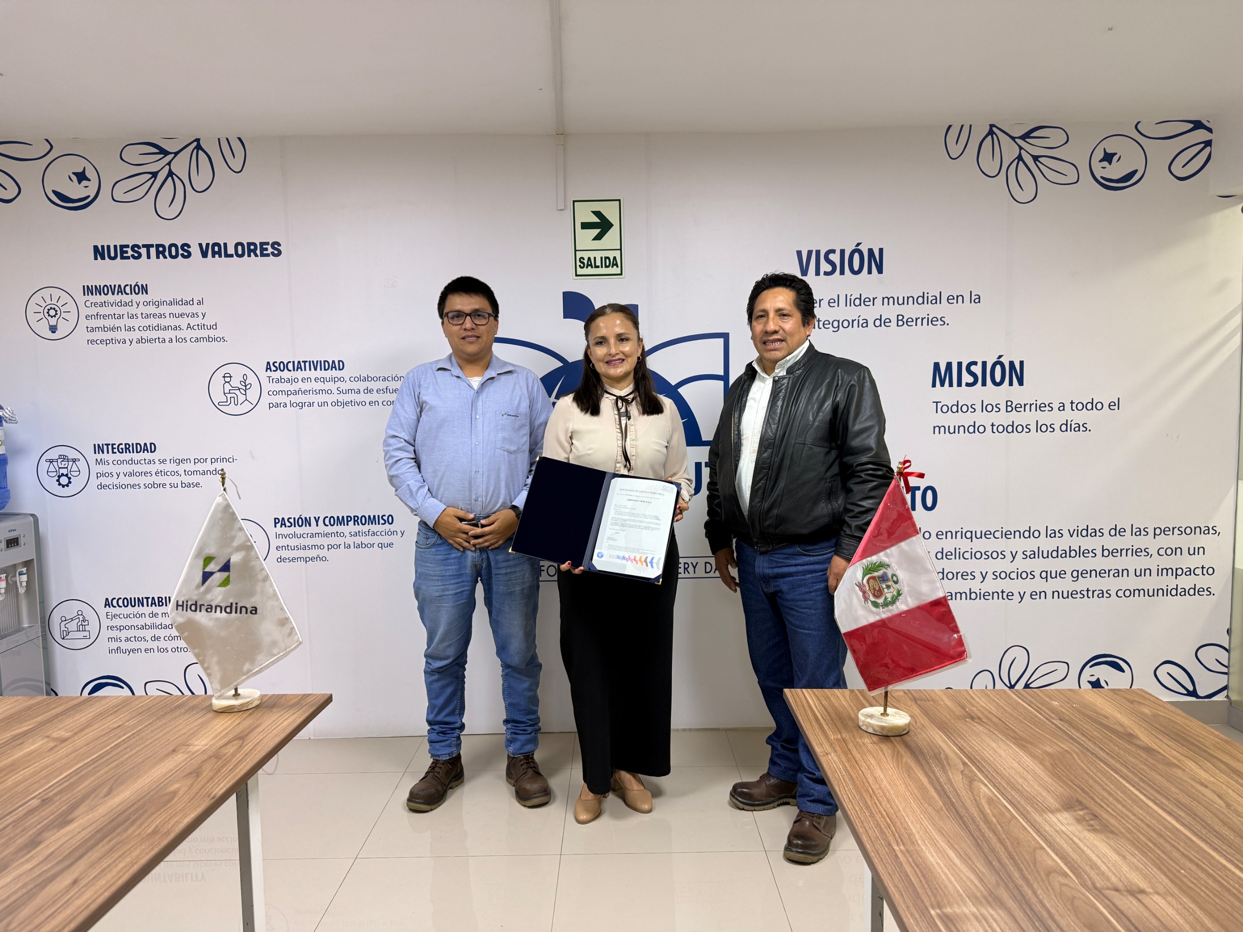 En un acto formal, Hidrandina hizo entrega oficial de esta certificación a su socio estratégico, HORTIFRUT PERÚ S.A.C. La entrega se realizó en las instalaciones del cliente, contando con la presencia del Ing. Javier Solis Canorio, Jefe de Unidad de Clientes Mayores de Hidrandina, y la apoderada legal de Hortifrut, Sra. Ethel Centurión Sánchez.