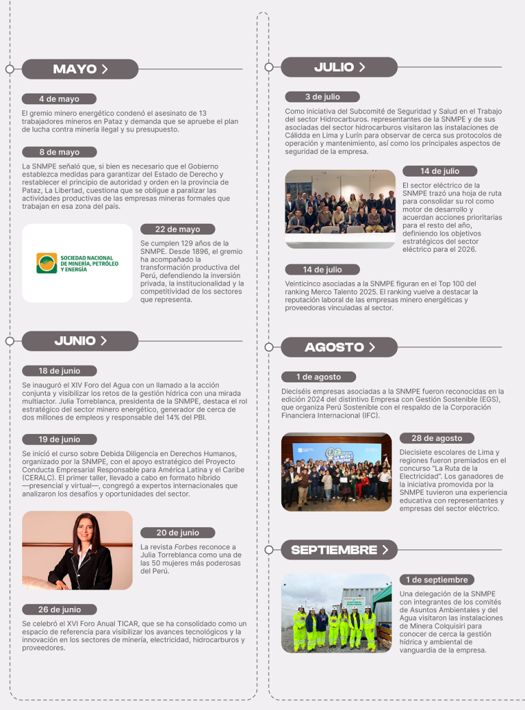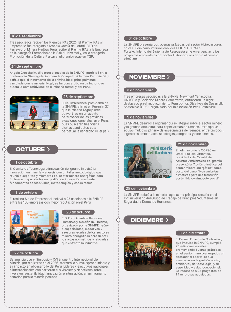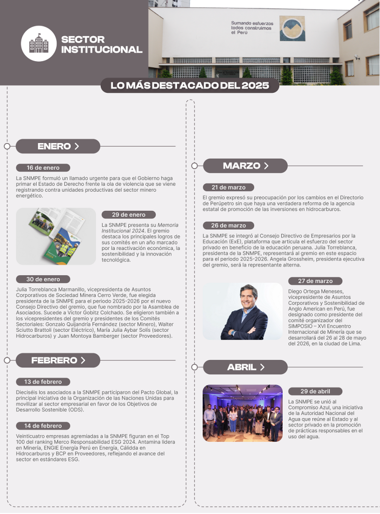 Actualidad>Tendencias> SNMPE: lo más destacado del sector Institucional en el 2025 Recopilamos los hechos más destacados del sector Institucional en el 2025. Publicado: miércoles 31 de diciembre de 2025 Recopilamos los hechos más destacados del sector Institucional en el 2025