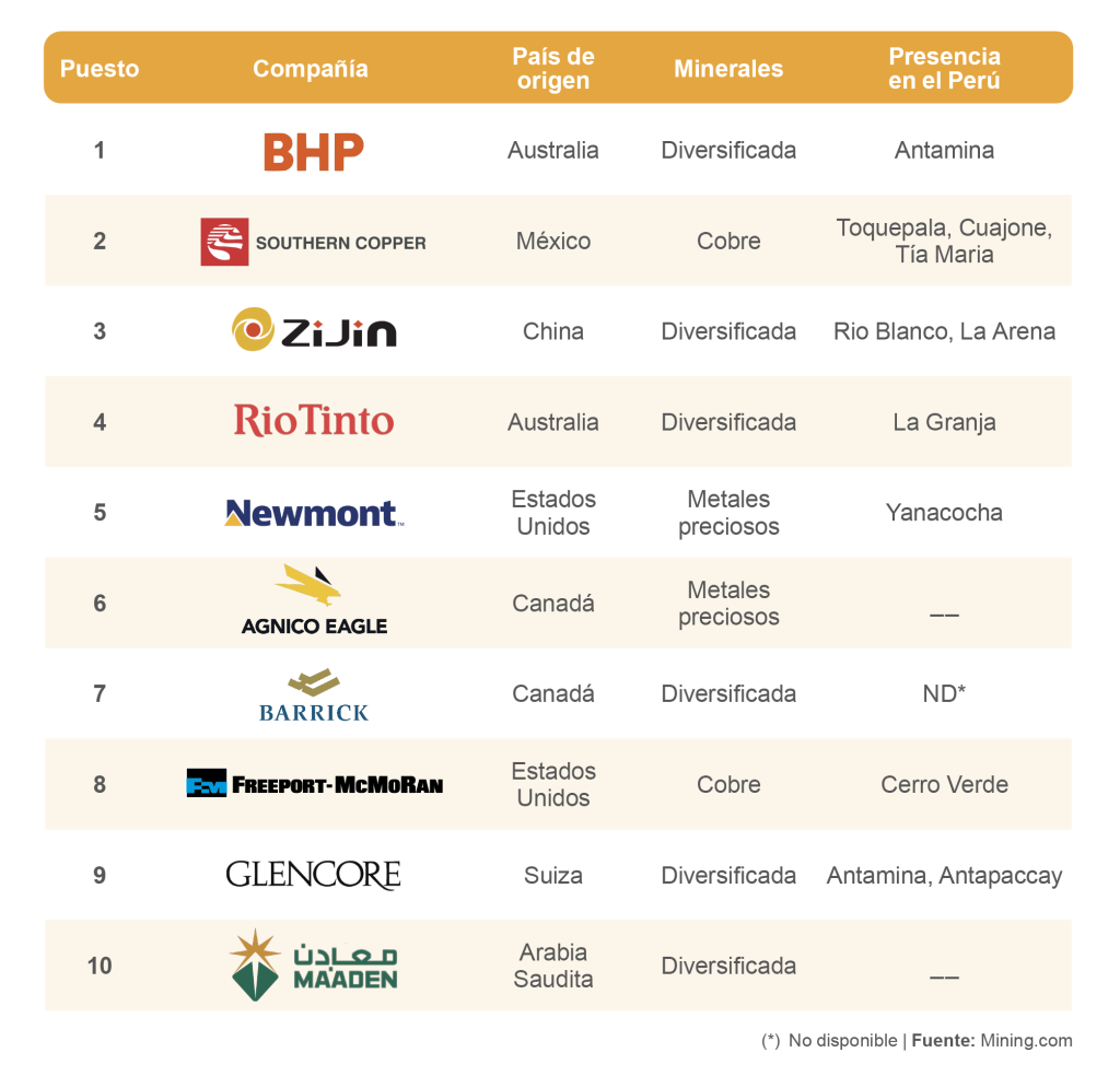 Las únicas dos empresas del Top 10 sin presencia en el Perú son la canadiense Agnico Eagle (6.°) —que superó por primera vez los US$ 100 mil millones— y la estatal saudí Ma’aden (10.°).