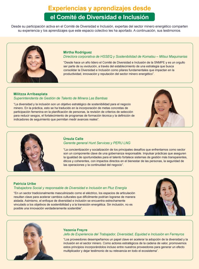 Desde la Sociedad Nacional de Minería, Petróleo y Energía (SNMPE), la promoción de la igualdad de oportunidades y el respeto de los Derechos Humanos forma parte de un compromiso sostenido. Este esfuerzo se materializó en el 2017 con la creación del Grupo de Trabajo de Diversidad e Inclusión, concebido como un espacio transversal de diálogo, aprendizaje y acción colectiva.
