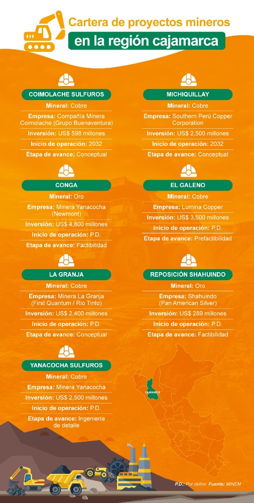 De acuerdo con las últimas cifras del Boletín Estadístico Minero (BEM) del Ministerio de Energía y Minas (MINEM), Cajamarca cuenta con siete proyectos mineros de cobre y oro que suman una inversión que supera los US$ 16,586 millones.