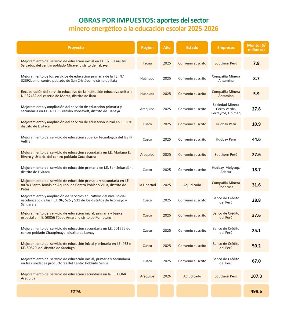 Pan American Silver – Shahuindo, Las Bambas, Yura, Ferreyros, Banco de Crédito del Perú, Sociedad Minera Cerro Verde, Compañía Minera Coimolache, SGS, Hudbay, Poderosa y Molycop han contribuido a través de OxI a la educación a través de diferentes proyectos que sumados superan los S/ 1,700 millones.